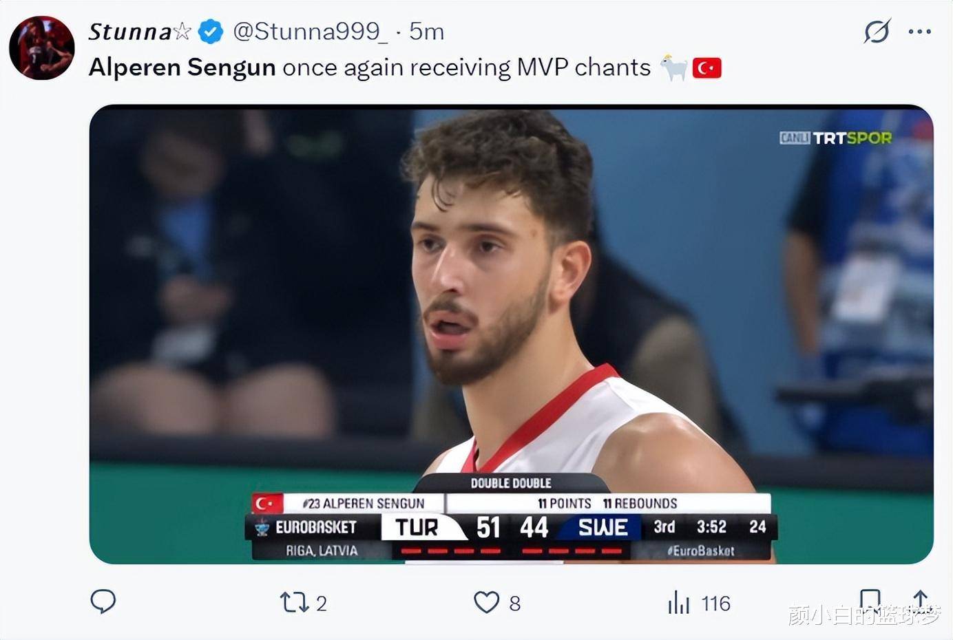 赛后休斯顿当地媒体《太空城篮球》发文盛赞:\申京24 16 6 2帽!这已经是他连续第六场当选单场最佳球员,让我们为这位未来MVP欢呼吧!\社交媒体上,申京MVP的话题迅速冲上热搜,多位NBA球探在现场观战后表示:\他的进步速度令人震惊,这绝对是一个未来能改变联盟格局的球员。\土耳其主帅在新闻发布会上难掩喜悦:\当比赛进入关键时刻,我们知道把球交给谁,他就是为这样的大场面而生的。\