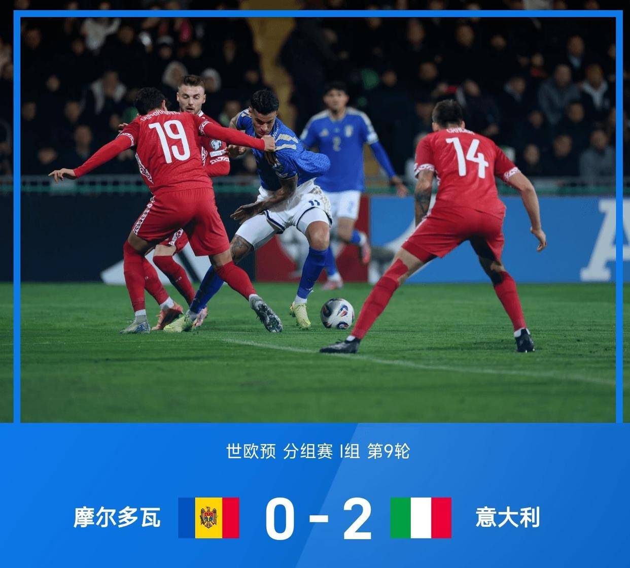 与此同时,其他赛场的比赛同样扣人心弦。 在基希讷乌,意大利面对摩尔多瓦的密集防守,直到第88分钟才由曼奇尼头球破门。补时阶段,埃斯波西托再入一球,意大利2-0艰难取胜。