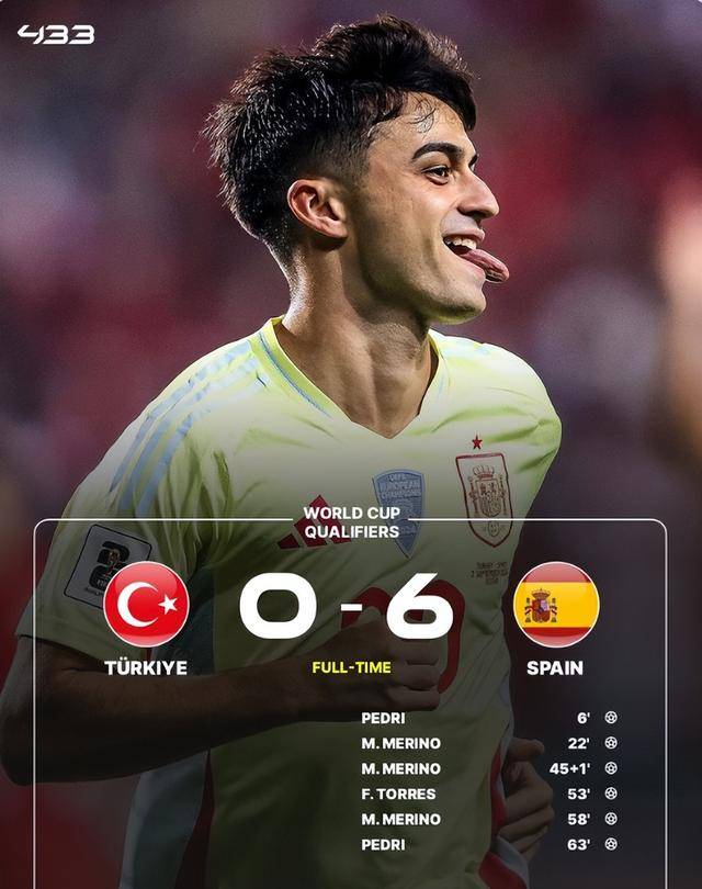 西班牙还没有理论上出线,但已经无比接近,领先土耳其3分,净胜球是14个,只要不在主场0比7输给土耳其,西班牙就可以获得小组第一。