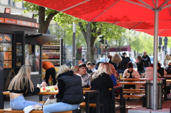 2022年4月28日,人们在德国柏林菩提树下大街的露天餐厅休闲。新华社记者任鹏飞摄