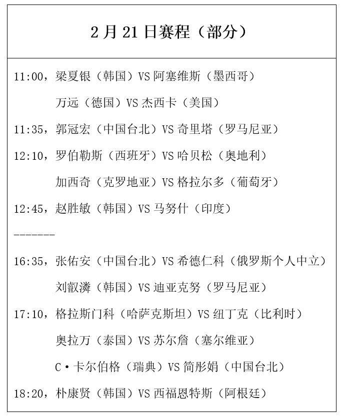 其余值得关注的场次还有下半场的部分资格赛第三轮较量,其中16:35中国台北新星、海口亚洲杯男单第四名黑马张佑安将亮相,对决新科大运会男单冠军、俄罗斯个人中立运动员希德仁科,同一时间段韩国奥运冠军刘南奎之女刘叡潾登场,与罗马尼亚主力迪亚克努交手;17:10,淘汰法尔克的格拉斯门科将与比利时运动员纽丁克一较高下,C·卡尔伯格对阵中国台北主力简彤娟。