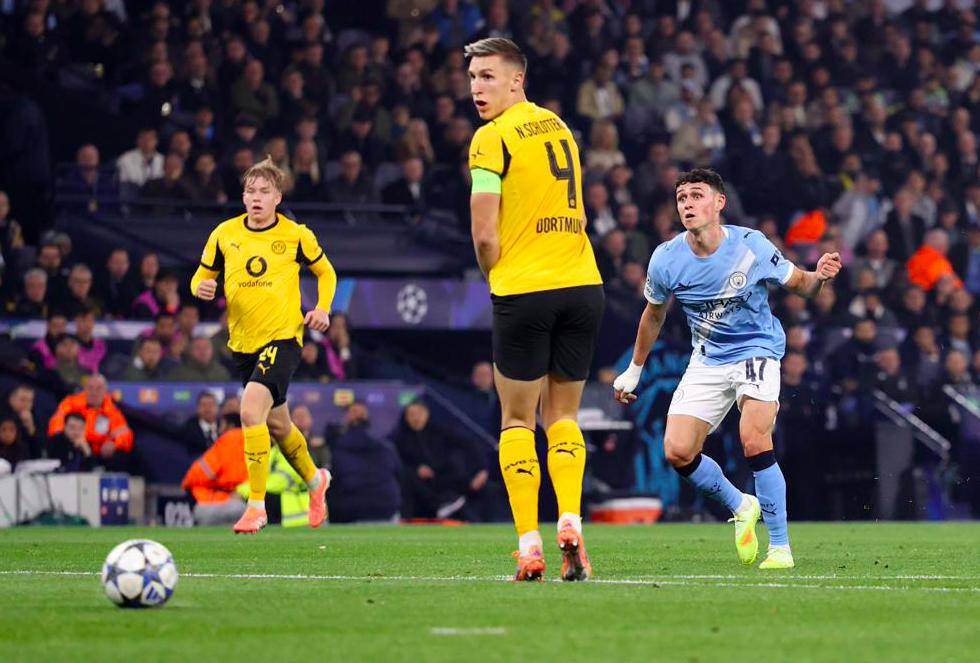 让我们把时钟拨回到比赛伊始。尽管控球率一度落于下风,但曼城却掌控着场上的主动权,射门次数遥遥领先。第20分钟,福登一脚石破天惊的远射,打破了场上的僵局。皮球如出膛的炮弹般直奔球门死角,多特蒙德门将科贝尔纵身扑救,也只能望球兴叹。