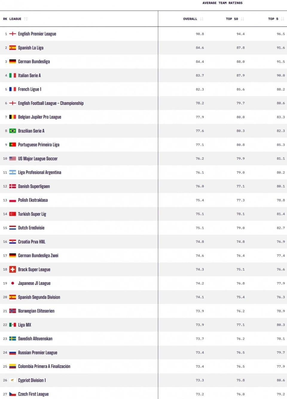 值得关注的是,英格兰第二级别联赛英冠的实力表现令人惊讶地高居第六位,在比甲、巴甲、葡超等其他传统足球强国的一级联赛之上。而梅西效力的美职联则排名第十。