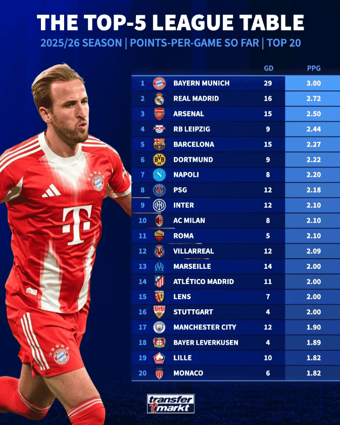 拜仁本赛季的开局堪称“梦幻起步”,其场均3分的表现不仅反映出球队的统治力,更凸显了德甲整体竞争格局的稳定与提升。而皇家马德里与阿森纳的紧随其后,也说明了西甲与英超强队依旧保持着极高的竞技水准。