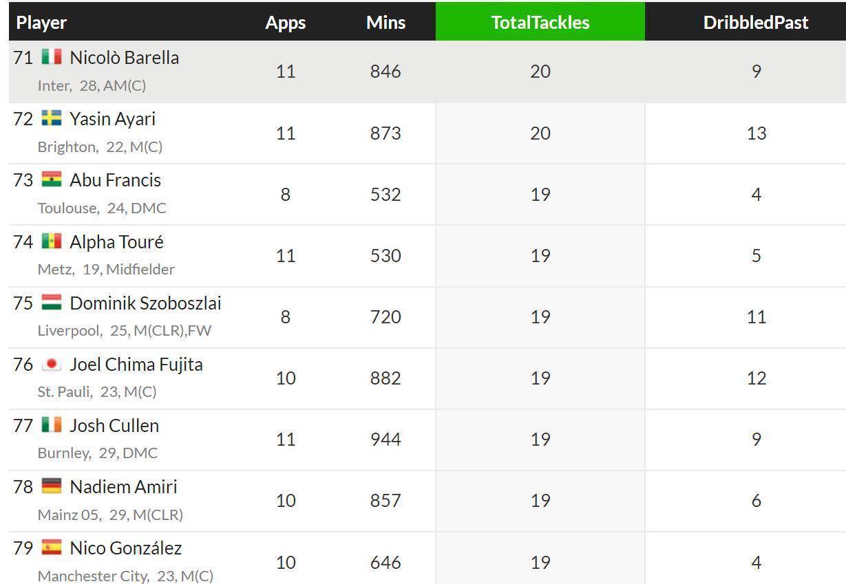 球队唯一的亮点是苏契奇,他有14次断球,且是在出场时间远少于巴雷拉的情况下完成的。 但这位年轻球员也存在问题,他的抢断成功率仅为46.3%,且是球队每90分钟犯规和拿到黄牌最多的球员。